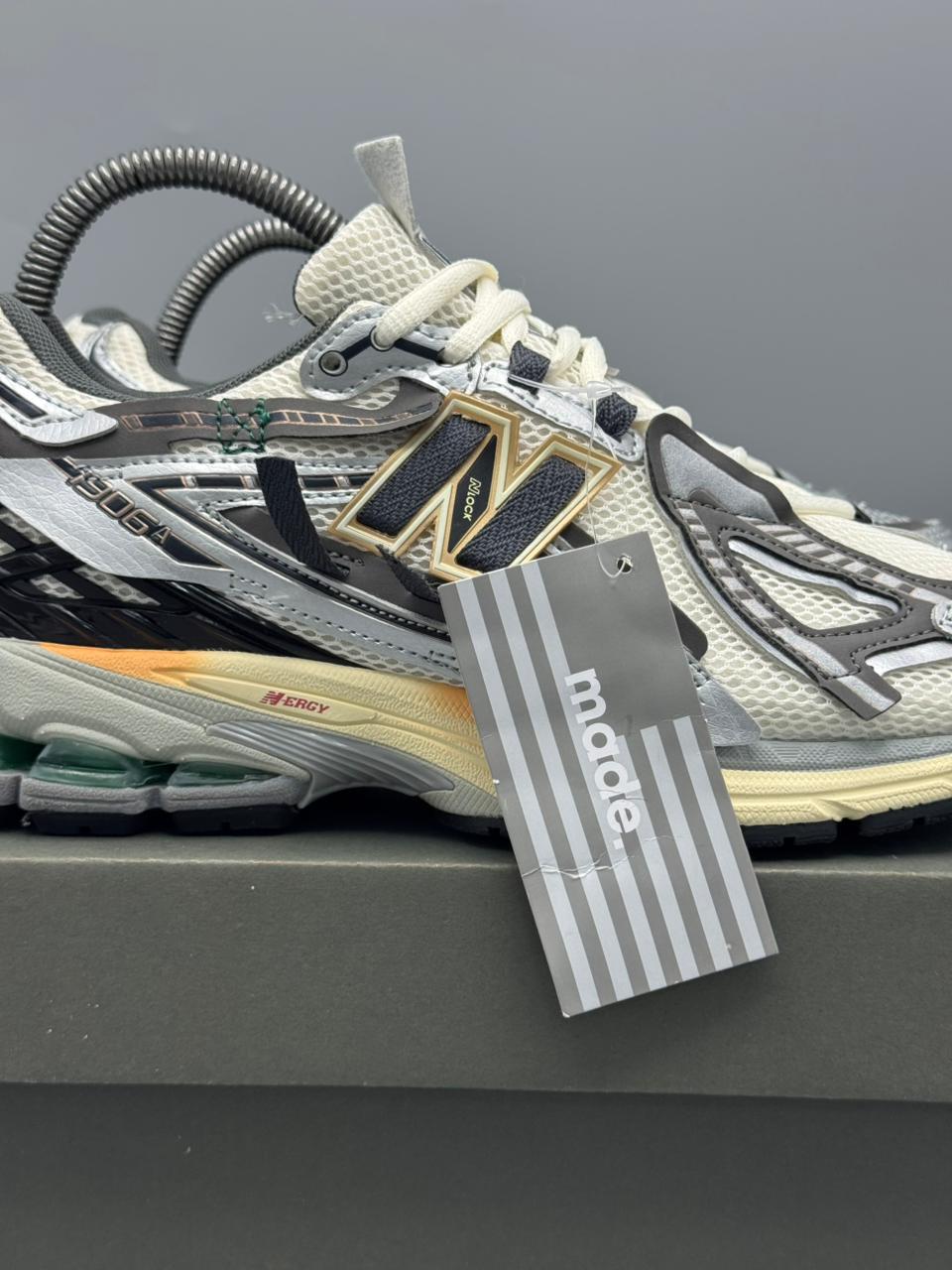 Su upper en malla transpirable con overlays sintéticos y detalles metálicos aporta ligereza, soporte y un look futurista. La combinación de tonos grises, negros y acentos dorados crea una silueta versátil y sofisticada, ideal tanto para outfits urbanos como para uso diario.