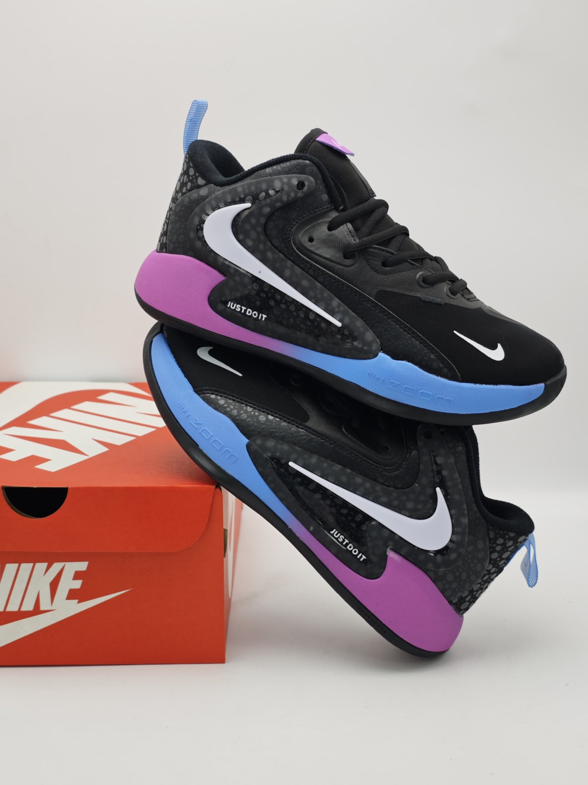 Con una base negra elegante combinada con suela azul y fucsia, detalles en blanco y gris, y un diseño aerodinámico de alto impacto, estos sneakers son puro 🔥 para tu colección.